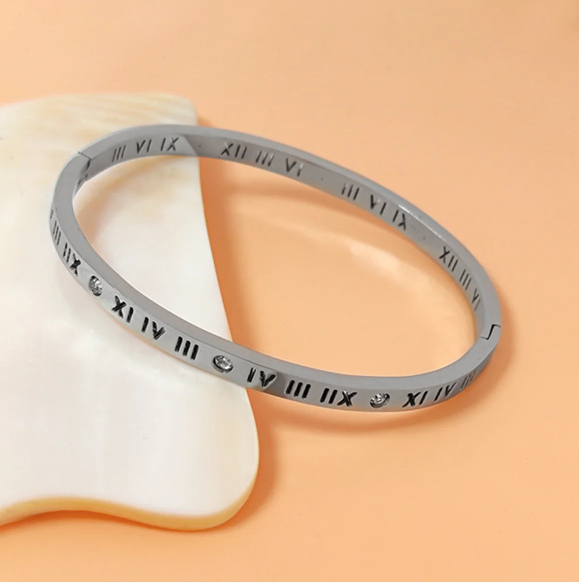 Women's bracelet made from durable titanium steel, adorned with sparkling diamonds and engraved with Roman numerals, elegant and timeless design, perfect for adding a touch of luxury to everyday outfits or special occasions, lightweight yet sturdy, resistant to tarnish and fading, easy to wear with a secure clasp, ideal as a gift or statement piece for fashion-forward women